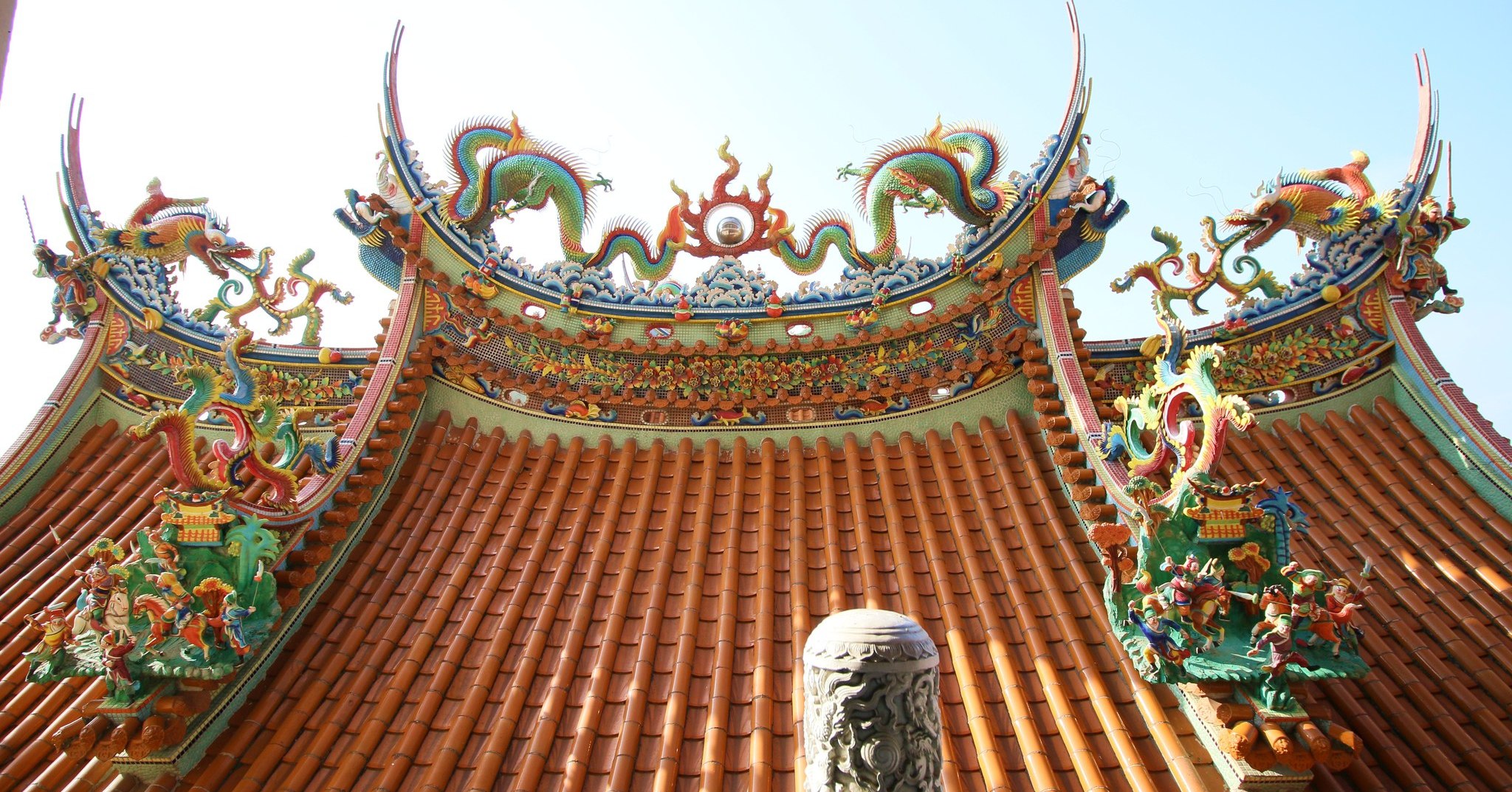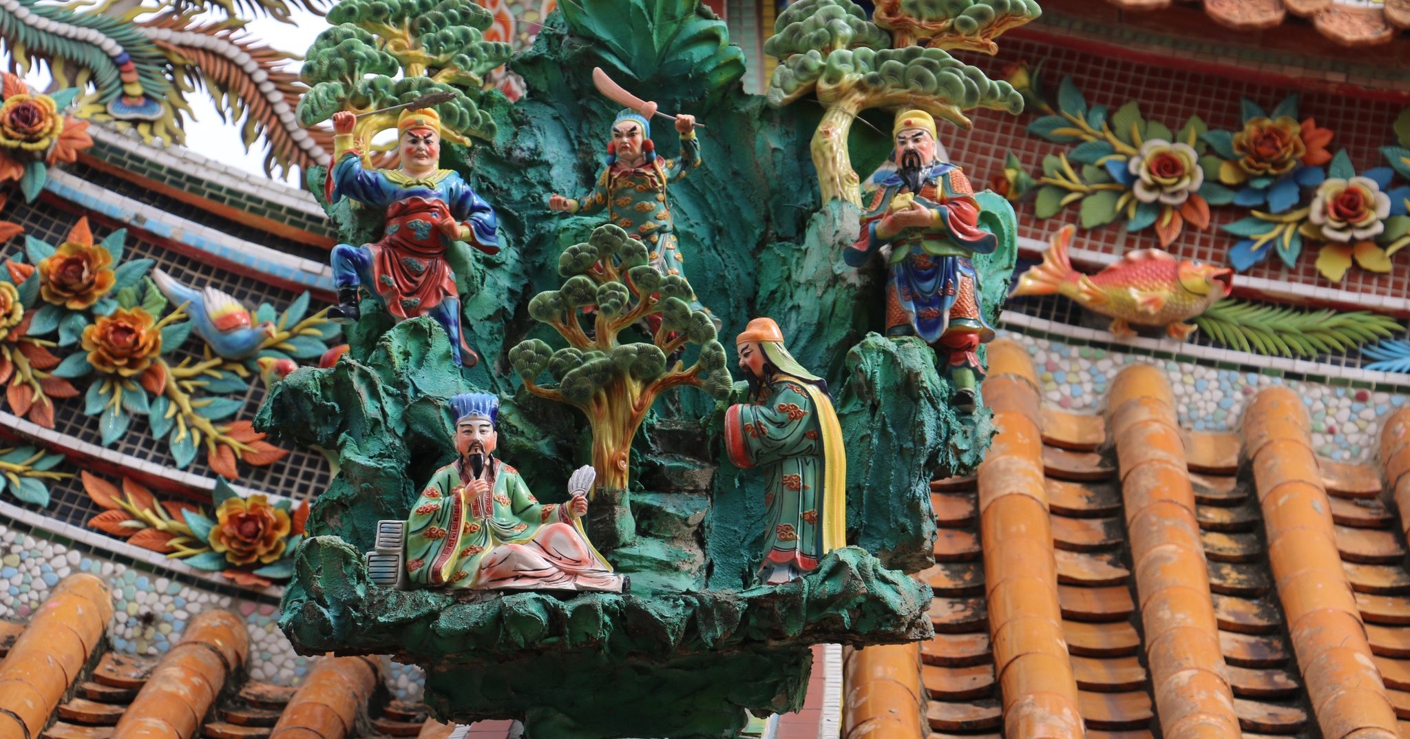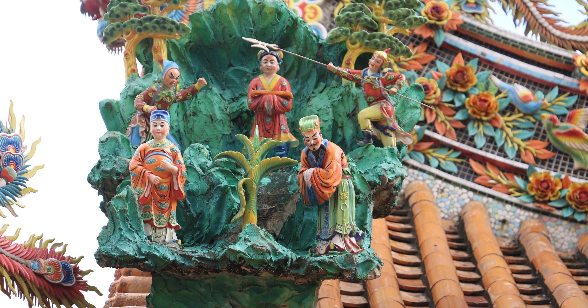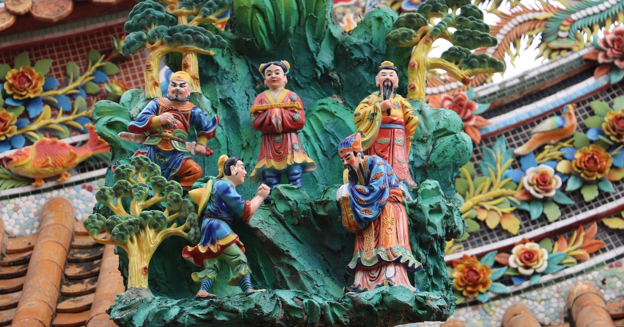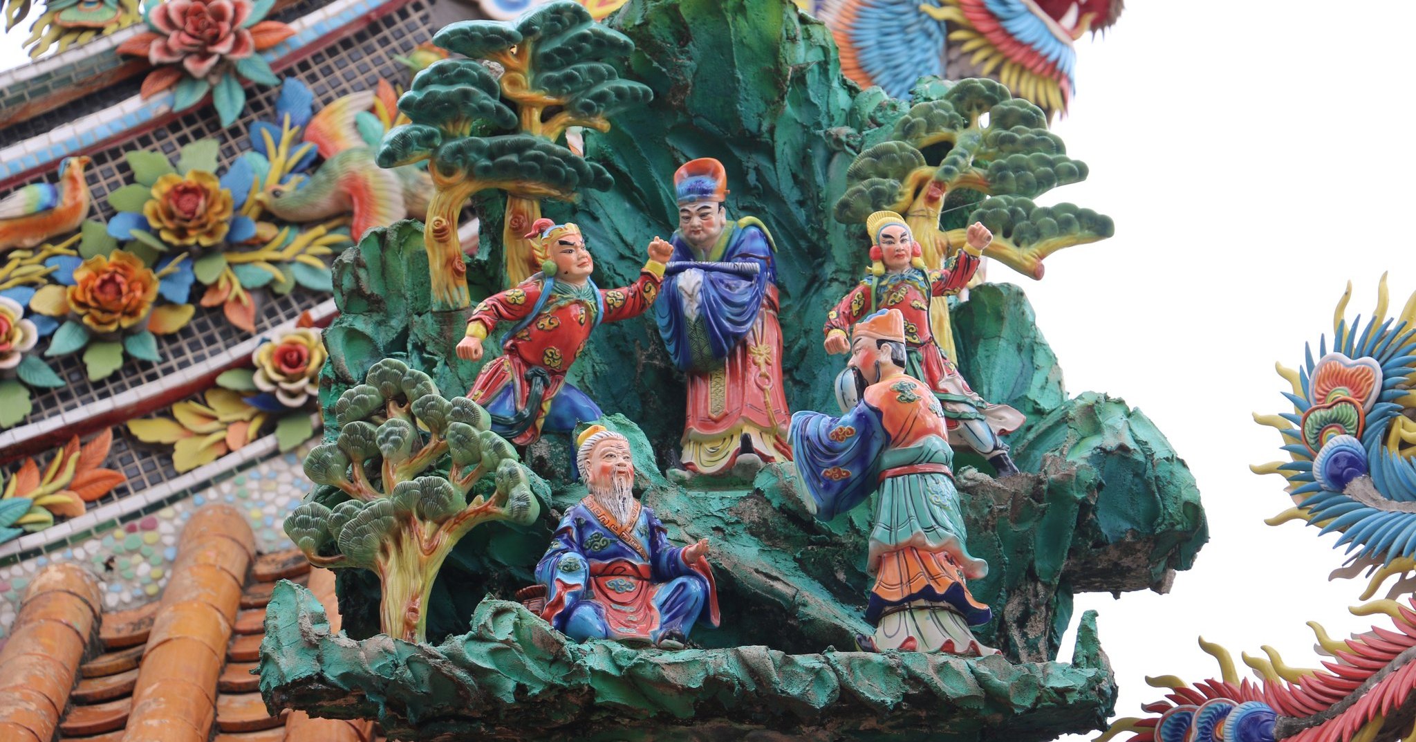 西港慶安宮的泥塑浮雕,出自名家潘麗水與其子潘岳雄之手,皆師承知名的畫師潘春源